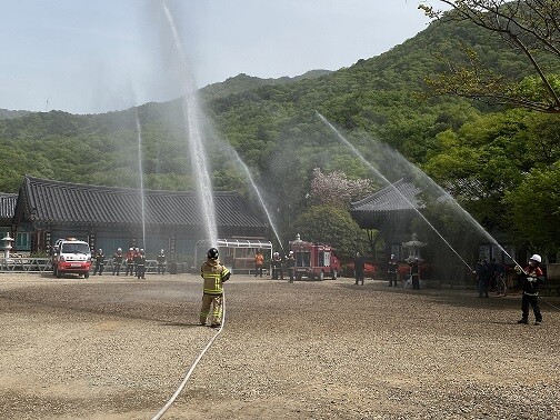 훈련에는 소방서와 양산시, 신흥사 관계자 등 50여명과 소방펌프차, 산불진화차 등 8대가 동원되었다.