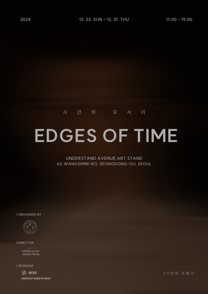 ‘시간의 모서리 [EDGES OF TIME]’는 오는 12월 22일(일)부터 12월 31일(화)까지 열흘간 진개최되며, 전시는 오전 11시부터 오후 8시까지 서울 성동구에 위치한 언더스탠드에비뉴 아트스탠드에서 진행된다.