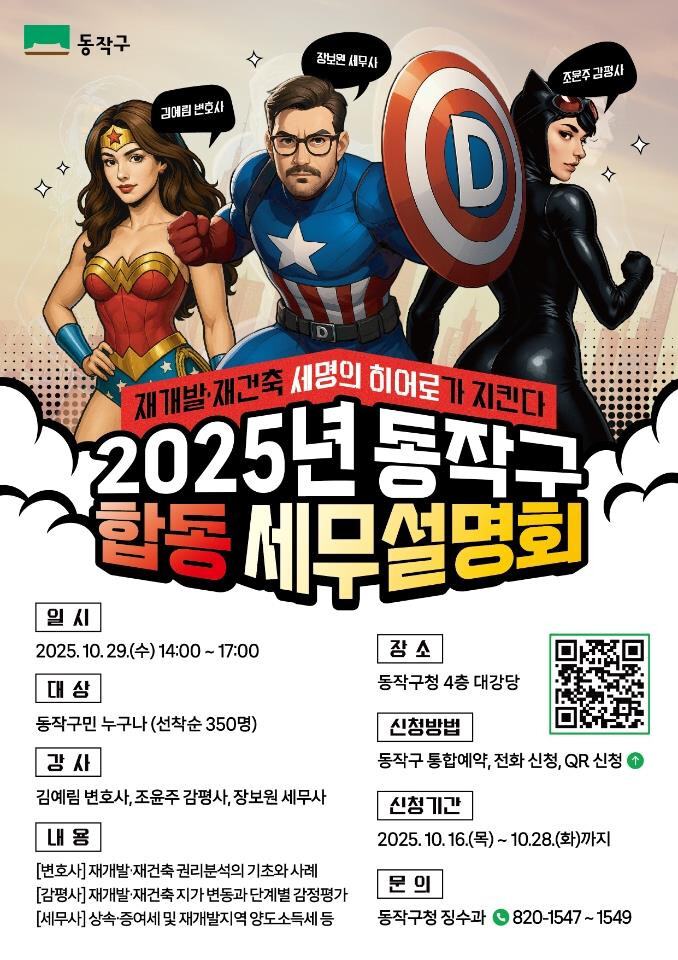 [시민일보 = 여영준 기자] 동작구(구청장 박일하)는 오는 29일 오후 2시, 구청 신청사 4층 대강당에서 재개발 및 재건축 분야를 주제로 ‘2025년 합동 세무 설명회’를 개최한다고 밝혔다.