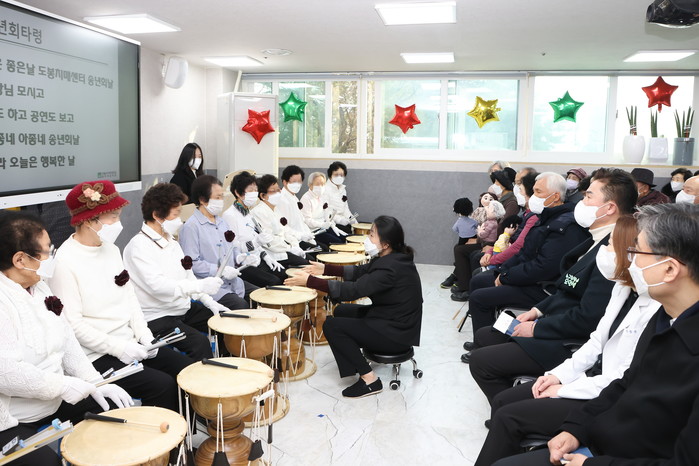 서울 도봉구 치매안심센터는 최근 2022년 송년회를 열었다. 송년회는 서울사이버대 음악치료 봉사동아리와 프로그램 참여 노인의 합동 음악회 공연을 시작으로 지난 1년간의 노인 활동영상 상영 등 치매노인 가족들이 화합을 다지는 시간으로 진행됐다. 사진은 송년회에서 오언석 구청장(오른쪽 세 번째)이 노인들의 공연을 관람하고 있는 모습. (사진제공=도봉구청)