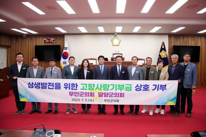 [무안=황승순 기자]무안군의회(김경현 의장)는 지난 5일 담양군의회(최용만 의장)와 고향사랑 기부제의 성공적 안착과 지역 상생 발전을 위해 상호 교차 기부에 동참했다.
