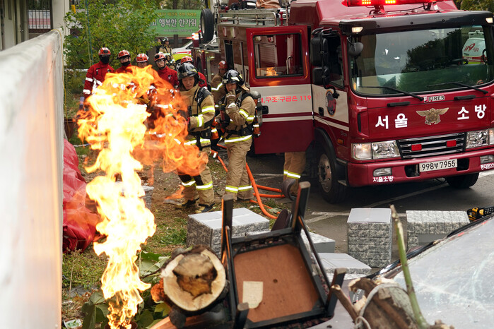 | ▲ 지난 1일 경동미주아파트에서 열린 재난대응 안전한국훈련에서 소방대원들이 화재를 진압하고 있다 (사진=동대문구청 제공) |