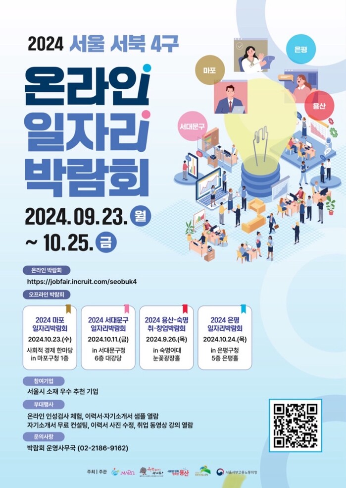 [시민일보 = 이대우 기자] 은평구(구청장 김미경)가 오는 23일~10월25일 ‘2024년 서울 서북 4구 온라인 일자리 박람회’를 개최한다.