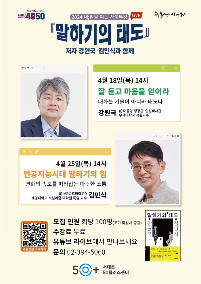 [시민일보 = 이대우 기자] 서울 서대문구(구청장 이성헌)가 운영하는 중장년 지원 기관 서대문50플러스센터가 4월 ‘말하기의 태도’를 주제로 강원국·김민식 작가 온라인 연속 특강을 열고 수강자를 모집한다.