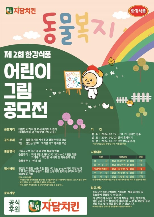 공모전 참가 대상은 대한민국에 거주하는 만 13세 이하의 어린이이며, 주제는 "동물복지로 자유롭고 행복한 닭의 모습"과 "맛있는 닭고기 요리를 먹고 행복한 모습"의 두 가지로 설정되었다. 접수는 2024년 7월 22일부터 8월 25일까지 온라인으로 진행되며, 결과는 9월 3일 한강식품 공식 홈페이지를 통해 발표된다. 시상식은 9월 7일 한강식품 본사에서 개최되며, 시상식 당일에 동물복지 닭 생산 시스템 견학도 진행될 예정이다.