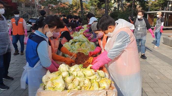 경기 (사)오산시자원봉사센터가 최근 사랑의 김장나눔 행사를 열고 김장 김치(10kg) 340통을 만들어, 지역내 취약계층과 지역내 사회복지기관 등에 전달했다. 사진은 이날 봉사자들이 김장을 하고 있는 모습. (사진제공=오산시청)