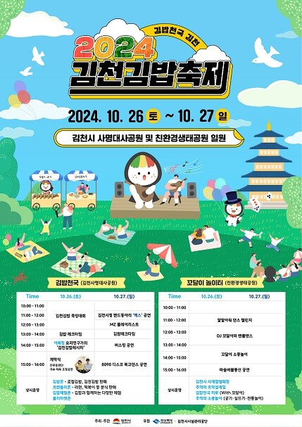 [김천=박병상 기자] 김천시는 10월 26일(토)부터 27일(일)까지 사명대사공원 및 친환경생태공원 일원에서『2024 김천김밥축제』를 개최한다.