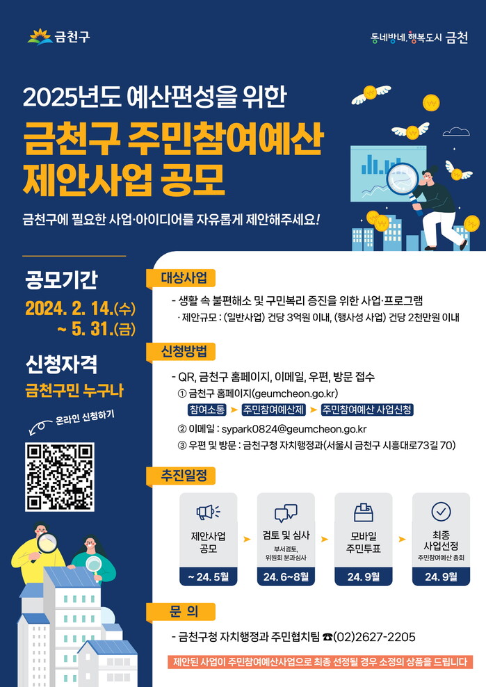 [시민일보 = 여영준 기자] 금천구(구청장 유성훈)는 오는 5월31일까지 2025년도 예산편성에 반영할 ‘주민참여예산 제안사업’을 집중 공모한다고 밝혔다.