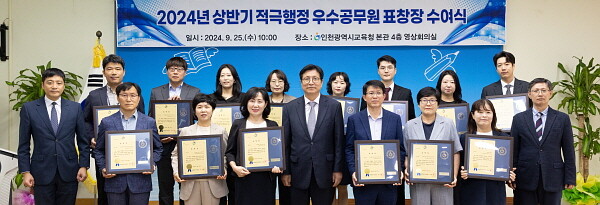 [인천=김형만 기자] 인천시교육청은 9월 25일 2024년 상반기 적극행정 우수공무원에게 표창장 수여식을 개최했다고 밝혔다.