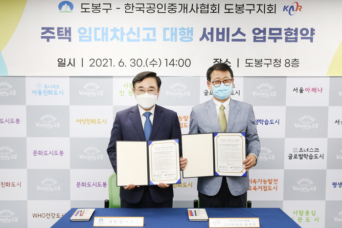 | ▲ 지난해 6월 이동진 구청장(왼쪽)이주택 임대차신고 대행 서비스 업무 협약식에서 기념촬영을 하고 있는 모습.(사진제공=도봉구청) |