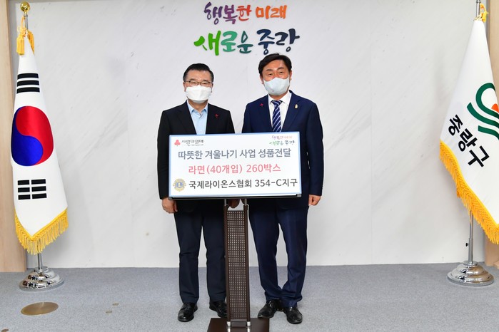 서울 중랑구는 지난 14일 국제라이온스협회 354-C지구로부터 2022 희망온돌 따뜻한 겨울나기 성품 라면(40개입) 260상자(600만원 상당)를 전달받았다. 성품은 서울사회복지공동모금회를 통해 지역내 어려운 이웃을 위해 사용될 예정이다. 사진은 전달식에서 류경기 구청장(왼쪽)과 신현종 총재가 기념촬영을 하고 있는 모습. (사진제공=중랑구청)