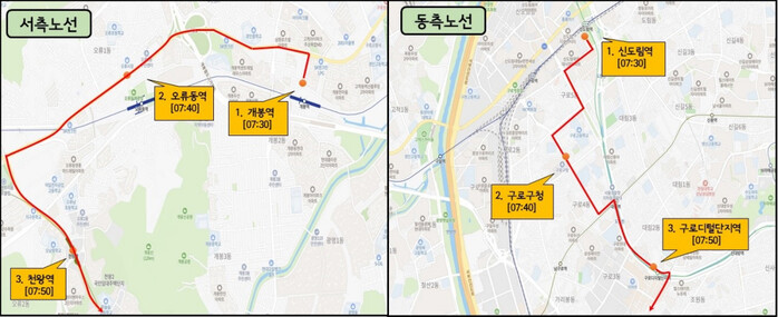 동측 노선은 오전 7시30분 신도림역을 출발해 구로구청 사거리, 구로디지털단지역을 경유해 훈련장에 도착한다.