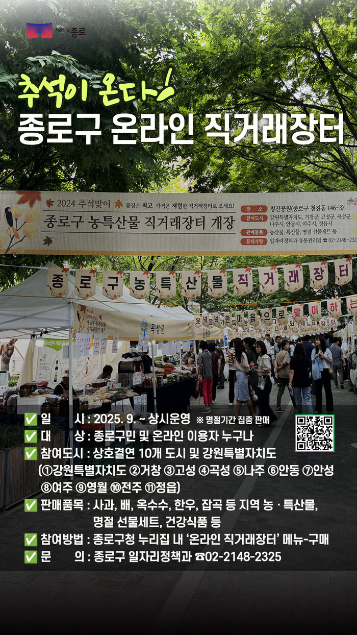 [시민일보 = 이대우 기자] 종로구(구청장 정문헌)가 추석을 맞아 50억원 규모의 ‘종로사랑상품권’을 발행하고 온라인 직거래 장터를 운영한다.