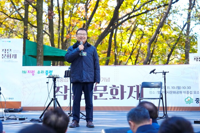 | ▲ 류경기 중랑구청장이 이중섭 묘소 쉼터 준공 기념 ‘작은 문화제’에서 인사말을 하고 있다. (사진=중랑구청 제공) |