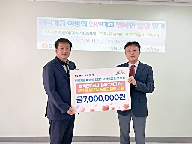 [시민일보 = 홍덕표 기자] 한국전력공사 강북성북지사가 서울 성북구 취약계층 아동의 생활안전과 가족 체험 프로그램 운영을 위해 후원금 700만원을 전달했다.