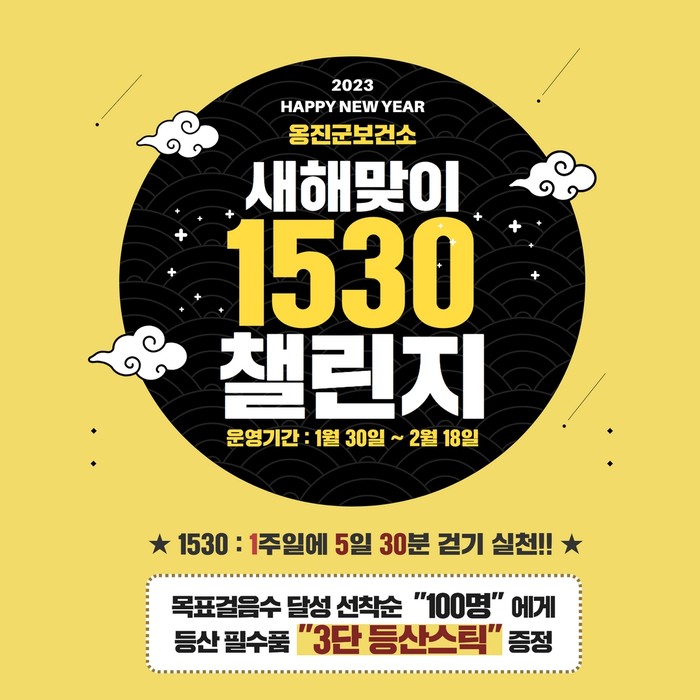 군 보건소 담당자는 "건강을 새해 계획으로 삼은 군민에게 좋은 기회가 될 것"이라며 "설 명절 후 시작되는 이번 챌린지에 많은 참여를 바란다"고 말했다.