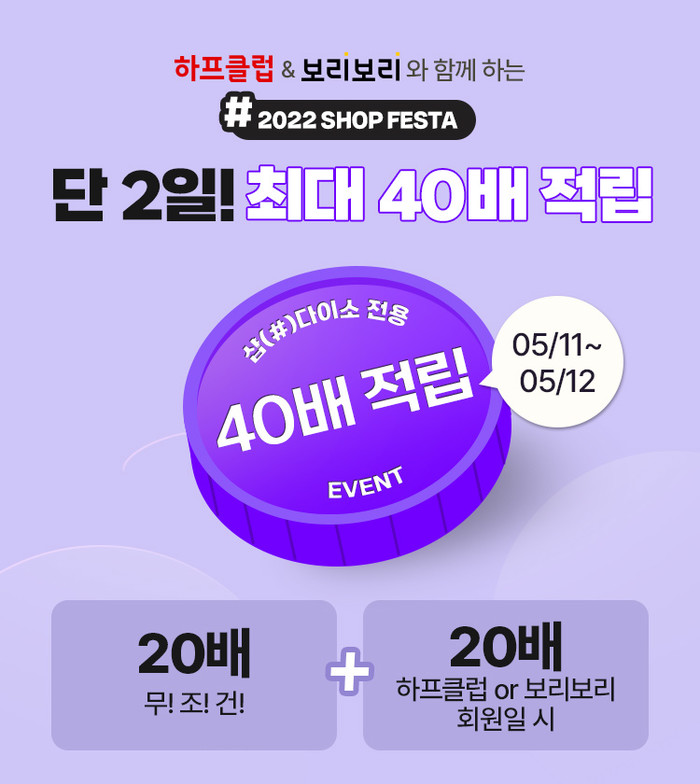 이번 이벤트는 샵다이소에서만 11~12일 이틀간 진행하며, 기간 동안 샵다이소에서 상품구매 시 다이소 멤버십 포인트 20배 적립이 되고, 또한 ‘하프클럽’또는 ‘보리보리’쇼핑몰 가입회원을 대상으로 20배 추가적립 혜택을 제공한다.