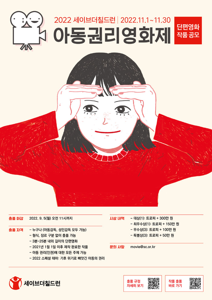 [시민일보 = 박준우 기자] 국제아동권리 NGO 세이브더칠드런이 주최하는 2022 아동권리영화제(CRFF, Child Rights Film Festival with Save the Children)가 오는 9월5일까지 단편영화 작품 공모전을 개최한다.