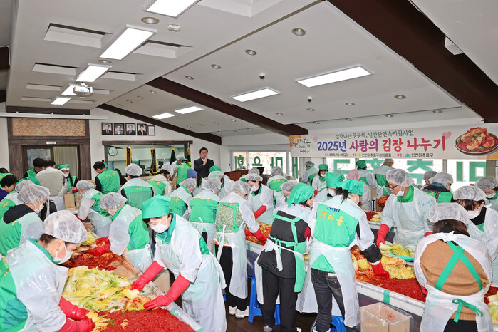 [인천=문찬식 기자] 인천 미추홀구새마을회(회장 추호성, 이하 새마을회)는 지난 5일 학익동 새마을회관에서 새마을지도자, 미추홀청년연대 등 80여 명이 참석한 가운데 ‘사랑의 김장 나눔’ 행사를 개최했다.