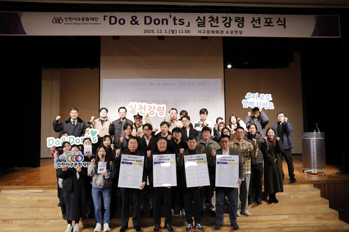 [인천=문찬식 기자] 인천서구문화재단(대표이사 김성하)은 지난 1일 서구문화회관 소공연장에서 ‘Do & Don’ts 실천강령 선포식’을 개최하고, 전 직원이 함께 참여하는 청렴·인권 조직문화 정착 의지를 공식적으로 밝혔다.