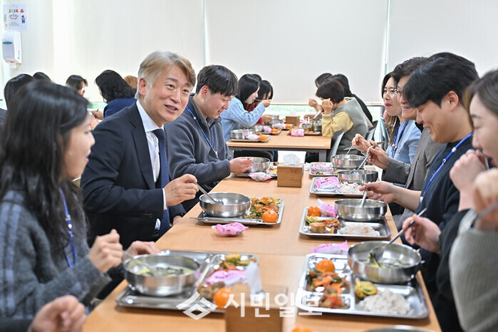 [광주=정찬남 기자] 김이강 광주광역시 서구청장(왼 쪽 두 번째)이 2일 2026년 시무식을 마친 후 구청 구내식당에서 직원들과 떡국으로 오찬을 함께하며 담소를 나누고 있다. / 광주광역시 서구청 제공