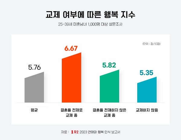 한국 2030 미혼남녀의 행복도는 10점 만점에 5.76점이었다. 이는 UN이 발표한 한국의 행복 지수(5.951점)보다 약간 낮았다.