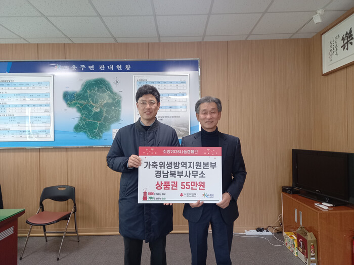 하원수 용주면장은 “가축위생방역지원본부 경남북부사무소의 따뜻한 기탁에 깊이 감사드린다”며 “보내주신 정성과 나눔의 마음이 지역사회에 큰 힘과 희망이 될 것”이라고 전했다.