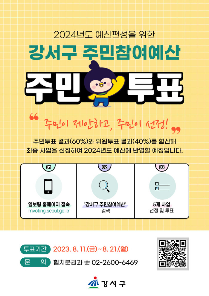 [시민일보 = 홍덕표 기자] 강서구가 2024년도 예산 편성을 위한 '주민참여예산 온라인 주민투표'를 오는 21일까지 진행한다.