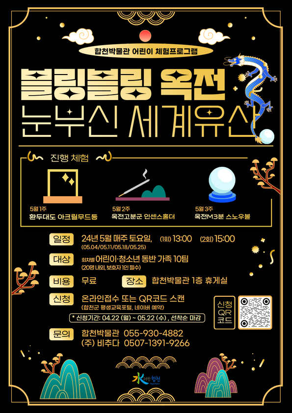접수는 회차별로 어린이.청소년을 동반한 가족 20명을 대상으로 합천군 평생교육포털, 네이버 예약페이지(QR코드)을 통해 4월 22일부터 5월 22일까지 신청하면 된다.