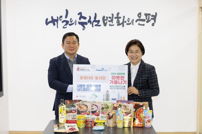 [시민일보 = 이대우 기자] 서울 은평구(구청장 김미경)는 최근 동원F&B 봉사단과 따뜻한 겨울나기 사랑의 이웃돕기 성품 전달식을 가졌다고 밝혔다.
