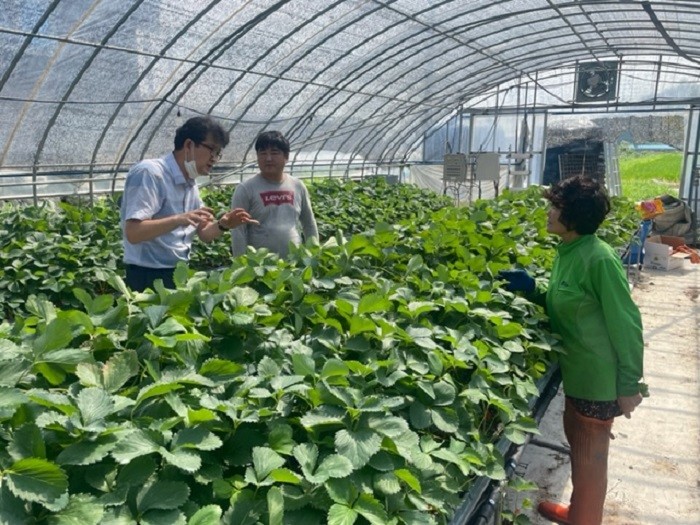 | ▲ 강진군 농업기술센터 관계자가 관내 하우스 딸기 재배 농가에서 딸기 육묘 기술 지도를 하고 있다. / 사진=강진군 제공 |