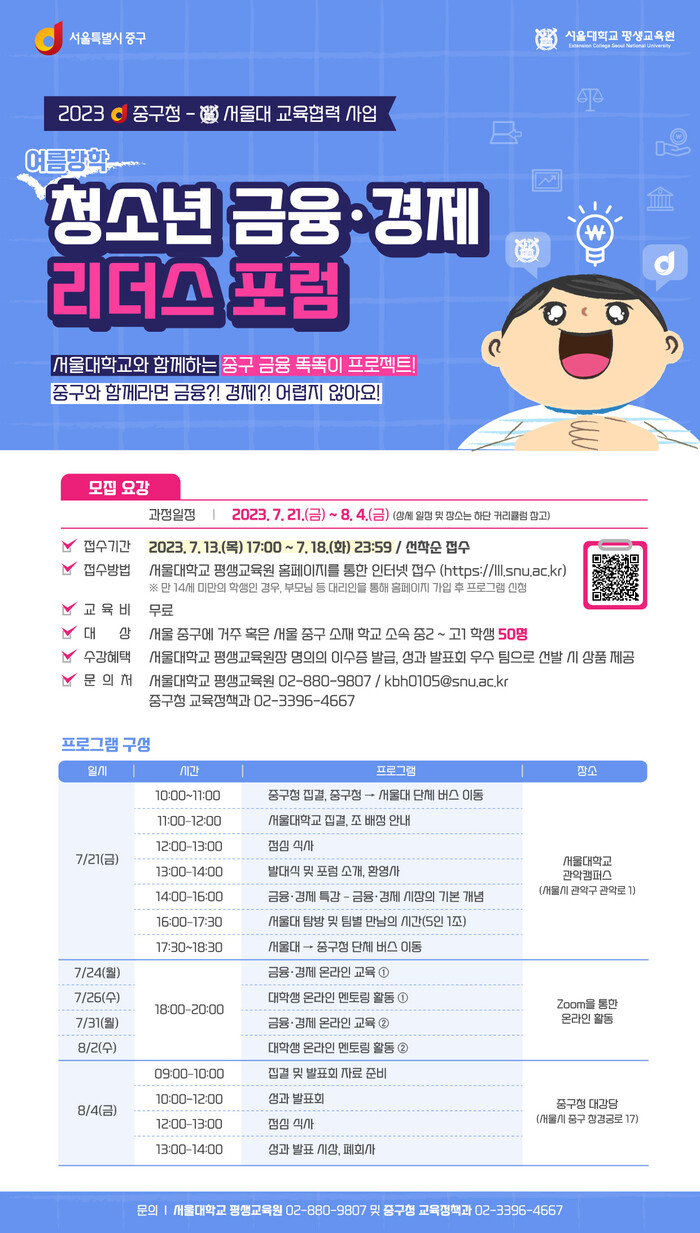 구에 따르면 금융경제 리더스 포럼은 서울대학교와 중구청의 교육협력 사업이다. 여름방학을 맞은 중·고등학생을 대상으로, 2주간 진행된다.