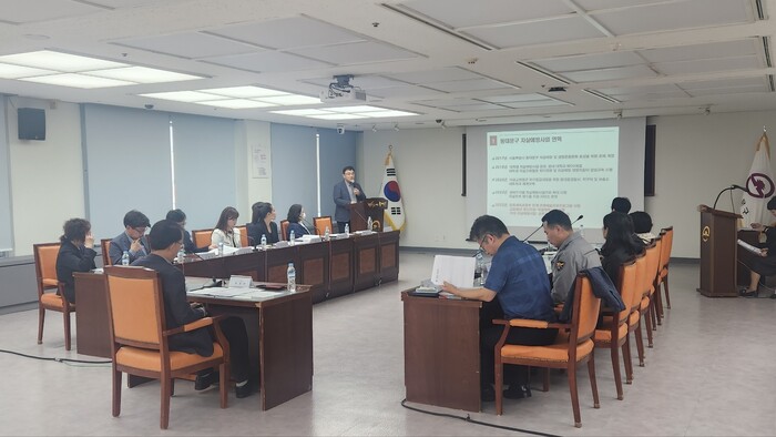 | ▲ ‘2023년 동대문구 자살예방협의회’ 회의 참가자들이 동대문구 자살예방사업 연혁에 대해 설명을 듣고 있다. (사진=동대문구청 제공) |