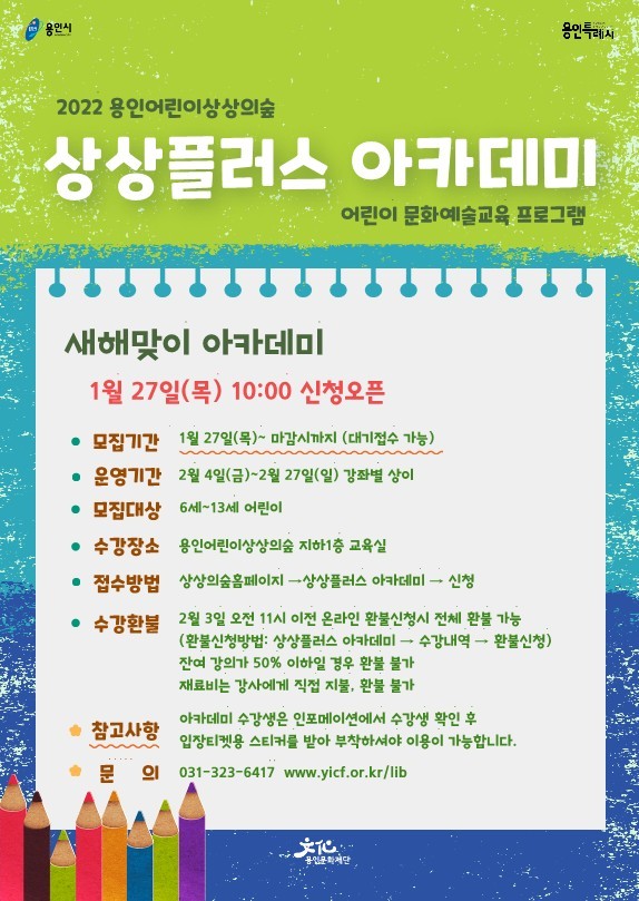 [용인=오왕석 기자] (재)용인문화재단(이사장 백군기)은 어린이를 위한 문화예술 교육프로그램 <상상플러스 새해맞이 아카데미>를 용인어린이상상의숲에서 오는 2월 4일부터 27일까지 진행한다.