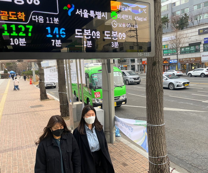 | ▲ 도봉구 버스정류장에 설치된 미세먼지를 모니터랑하는 스마트 장비에서 버스 도착시간과 미세먼지 정보가 함께 송출되고 있는 모습. (사진제공=도봉구청) |