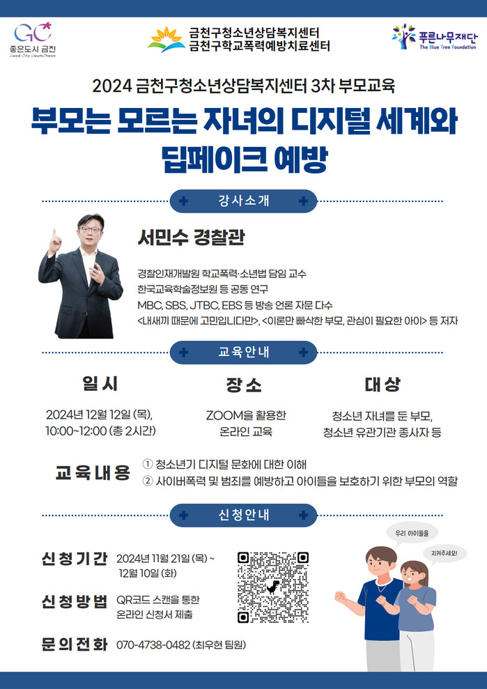 [시민일보 = 여영준 기자] 서울 금천구(구청장 유성훈)는 오는 12일 오전 10시 ‘부모는 모르는 자녀의 디지털 세계와 딥페이크 예방’이라는 주제로 온라인 부모교육을 진행한다고 밝혔다.