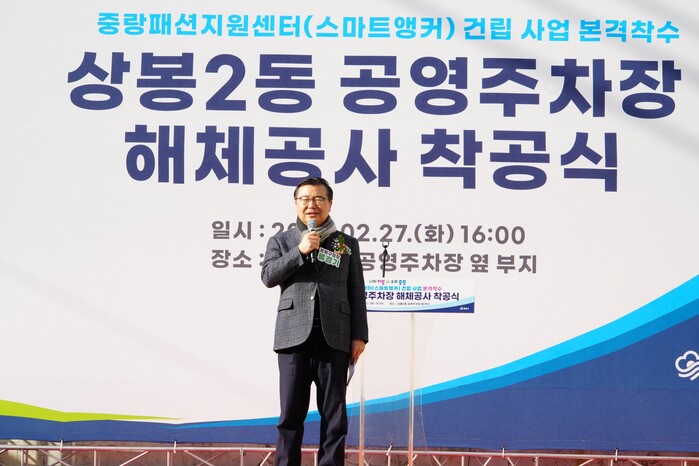 | ▲ 중랑패션지원센터 건립을 위한 상봉2동 공영주차장 해체공사 착공식에 참석한 류경기 구청장이 인사말을 하고 있다. (사진=중랑구청 제공) |