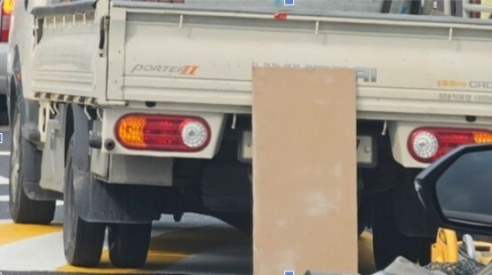 | ▲ 트럭이 합판으로 번호판을 가린 채 도로 위에 정차해 있다. (사진=마포구청 제공) |