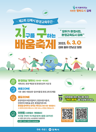 금년 제2회 환경교육주간 '지구를 구하는 배움 축제'는 시민이 즐겁게 참여하고 체험하면서 배울 수 있는 다채로운 환경교육 행사가 김해 전역에서 선보인다.
