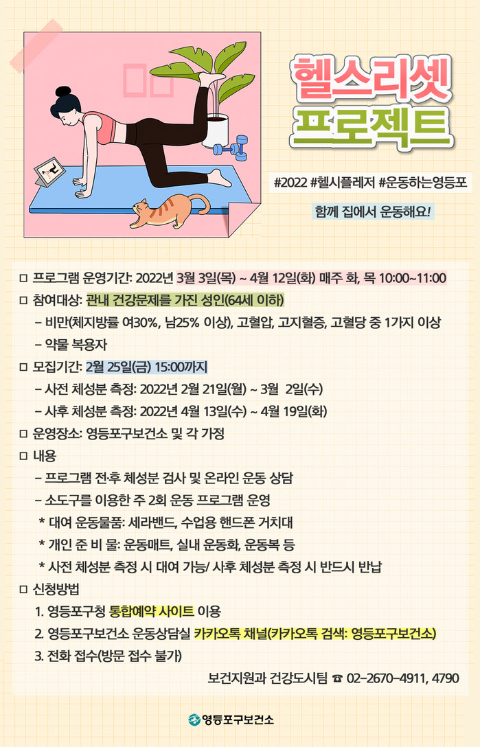 [시민일보 = 여영준 기자] 서울 영등포구(구청장 채현일) 보건소는 ‘2022년 헬스리셋 프로젝트’ 1기 참여자를 오는 25일까지 모집한다고 밝혔다.