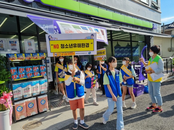 경기 양평군청소년방과후아카데미인 ‘또래공삶’은 최근 옥천면 일대에서 청소년유해환경감시단 캠페인을 전개했다. 이날 학생들은 청소년 보호 캠페인을 진행했으며, 초등학교 인근 식당 등에 ‘19세 미만 청소년에게 술·담배 판매금지 스티커’ 부착 여부를 확인하는 등 활동을 펼쳤다. 사진은 학생들이 학교 인근 편의점에서 캠페인을 펼치고 있는 모습. (사진제공=양평군청)