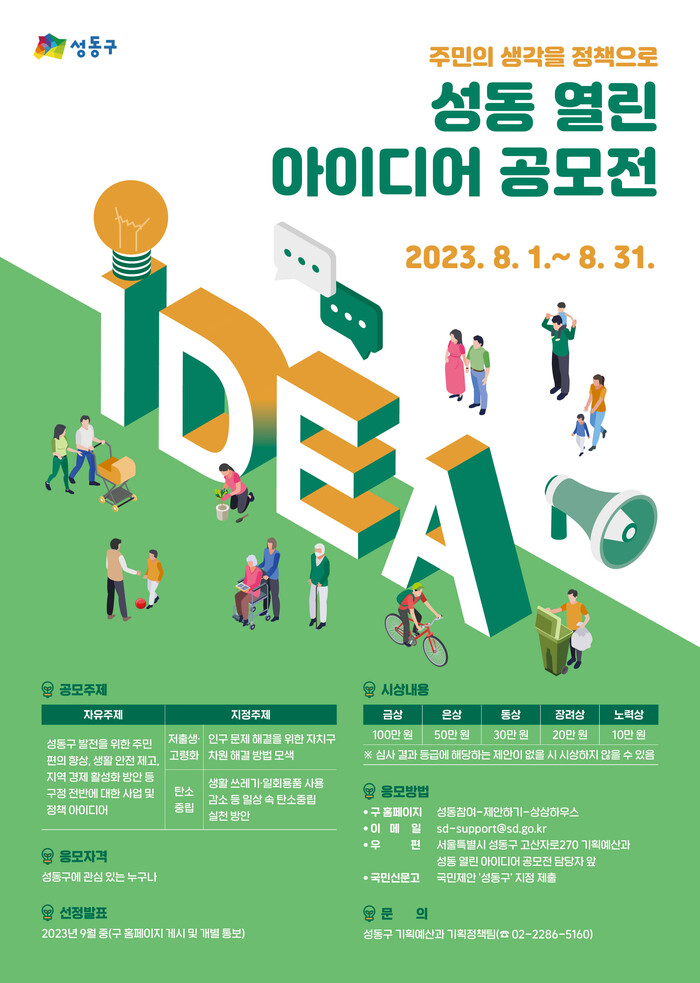 [시민일보 = 홍덕표 기자] 성동구(구청장 정원오)가 오는 31일까지 '2023 성동 열린 아이디어 공모전'을 개최한다.