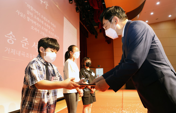 도봉구는 지난 11일 ‘가정의 달’과 ‘우크라이나 평화’를 주제로 열린 편지문학관 개관 기념 '전국 편지쓰기 공모전' 시상식을 개최했다. 대상 수상자는 동곡초등학교 3학년 오윤채(초등 저학년부), 사천초등학교 4학년 이혜린(초등 고학년부) 등 총 4명이다. 사진은 이동진 구청장(오른쪽)이 초등 고학년 수상자들에게 시상하고 있는 모습. (사진제공=도봉구청)