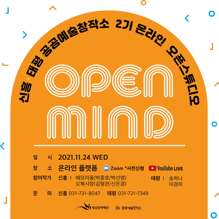 먼저 11월 24일(수) 오전 10시부터 오후 6시까지 오픈스튜디오 ‘오픈마인드’를 진행한다. 온라인 플랫폼 ZOOM과 성남문화재단 유튜브 채널을 통해 생중계로 진행하는 이번 오픈스튜디오는 신흥, 태평 공공예술창작소의 2기 입주예술가(팀)들이 프로젝트 소개와 연계 프로그램을 선보인다.