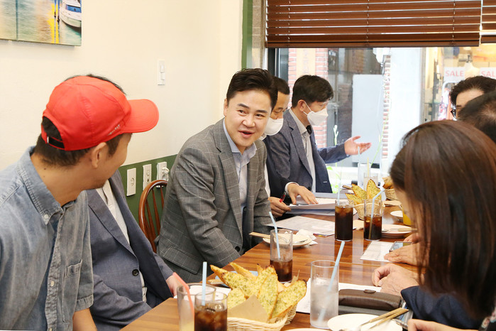 | ▲ 오언석 구청장(가운데)이 쌍리단길 상점가 상인들과 대화를 나누고 있다. (사진제공=도봉구청) |