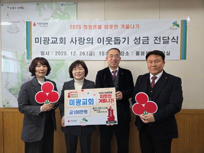 [시민일보 = 이대우 기자] 서울 은평구(구청장 김미경)가 최근 미광교회와 2026 희망온돌 따뜻한 겨울나기 사랑의 이웃돕기 성금 전달식을 가졌다.