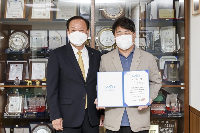 서울 마포구는 지난 5일 ‘제15회 마포나루 새우젓축제’ 총감독에 김연곤 감독을 위촉했다. 김 감독은 2018년부터 지난해까지 마포나루 새우젓축제 총감독으로 활동한 바 있다. 사진은 위촉식에서 유동균 구청장(왼쪽)과 김 감독이 기념촬영을 하는 모습. (사진제공=마포구청)
