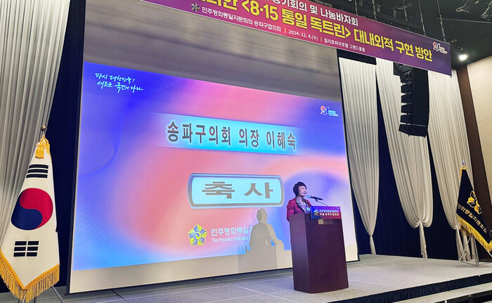 이혜숙 의장은 축사에서 “민주평통 송파구협의회가 2024년 활동들을 잘 마무리하고 내년에도 활발한 활동 이어가길 바란다. 올 한해 우리 대한민국은 대외적, 대내적으로 격동기를 겪었다. 하지만 좀 더 나은 자유대한민국을 만들어가기 위한 과정이라고 생각하며, 그 과정에서 민주평통 자문위원들이 큰 역할을 해주시기를 부탁드린다.”고 말했다.