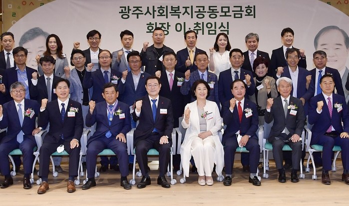 [광주=정찬남 기자] 이용섭 광주광역시장이 30일 오후 서구 골드클래스 대강당에서 열린 '광주사회복지공동모금회 회장 이·취임식'에 참석해 박철홍 신임회장 및 내빈들과 기념촬영을 하고 있다./광주광역시 제공