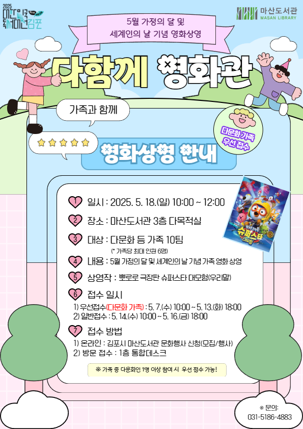 이번 상영될 작품은 '뽀로로 극장판 슈퍼스타 대모험'으로, 도서관 관계자는 “화창하고 기분좋은 봄날 주말 나들이 삼아 온 가족이 함께 도서관에서 책도 읽고 영화도 관람하며 또 하나의 추억을 만들 계기가 될 수 있었으면 좋겠다”고 전했다.